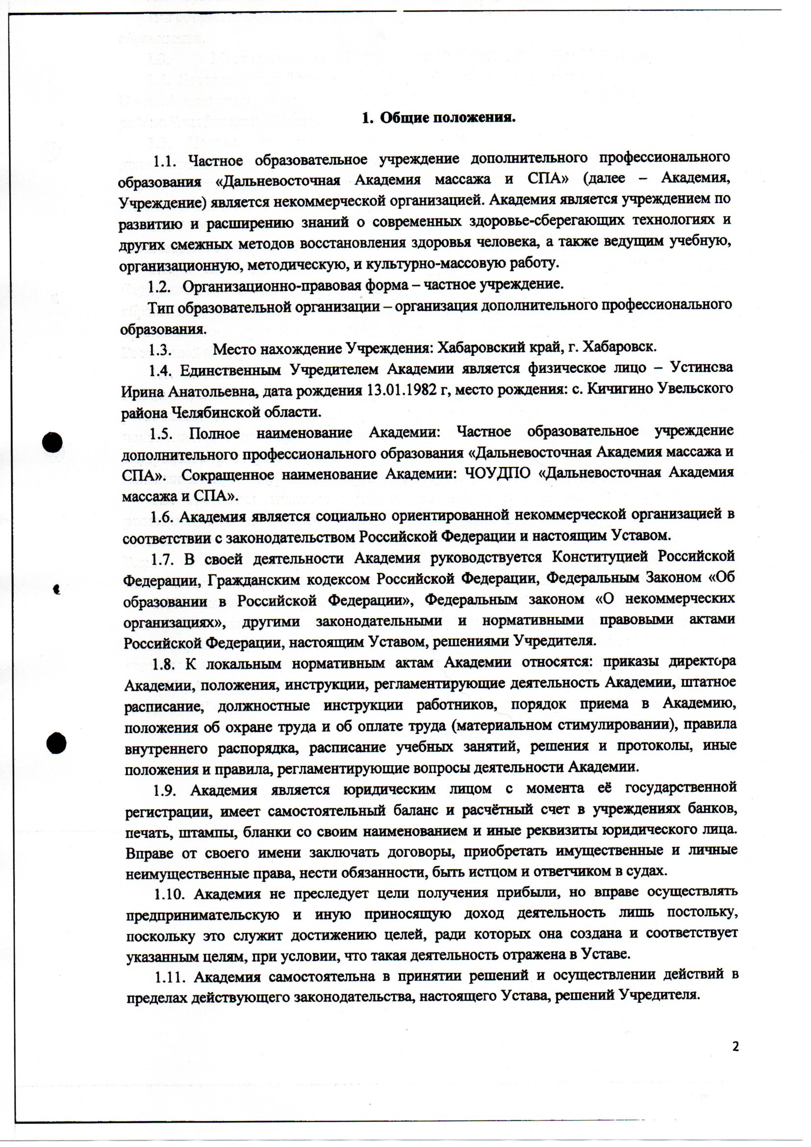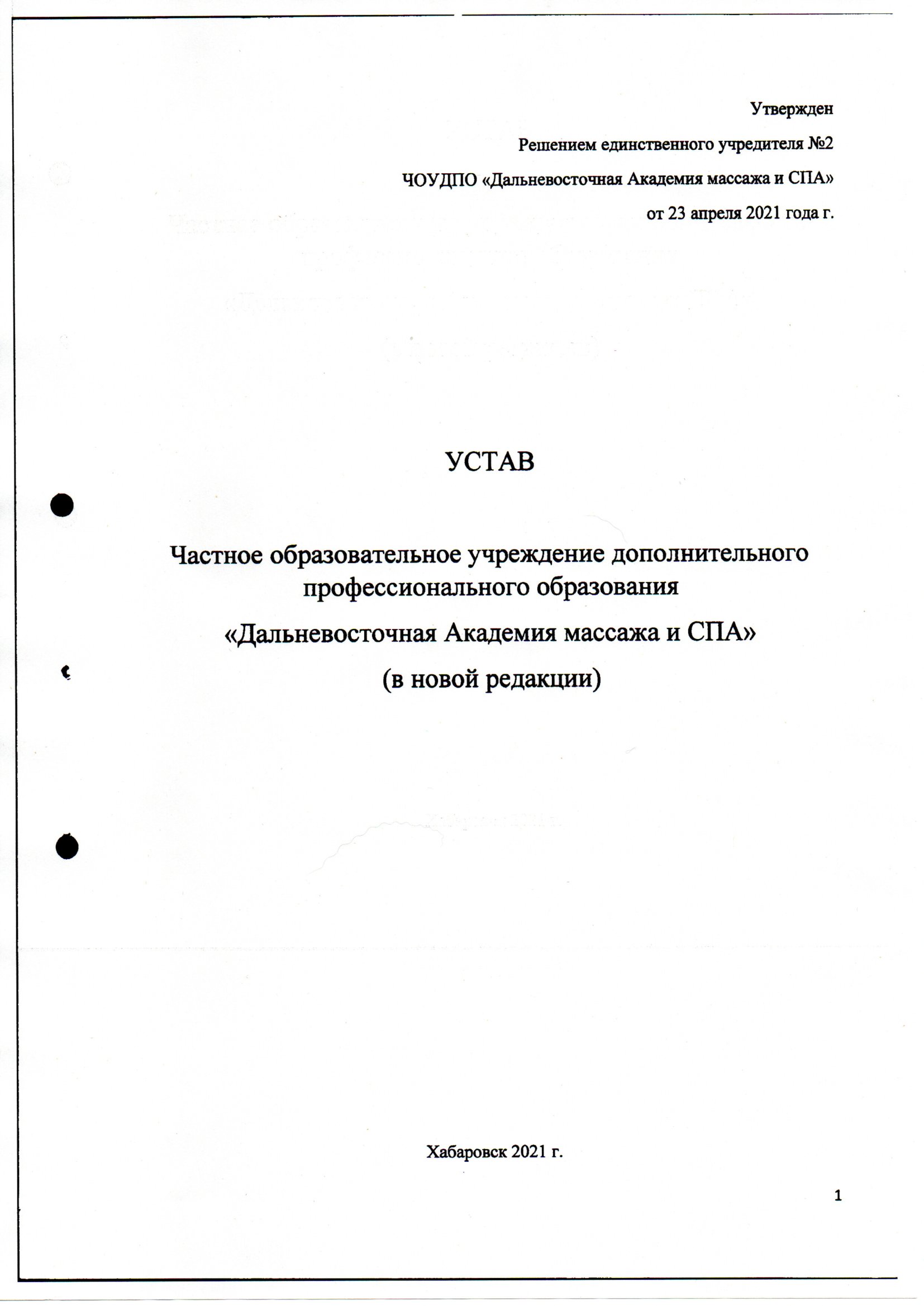 Устав ЧОУДПО "Дальневосточная Академия массажа и СПА" от 23.04.2021 г