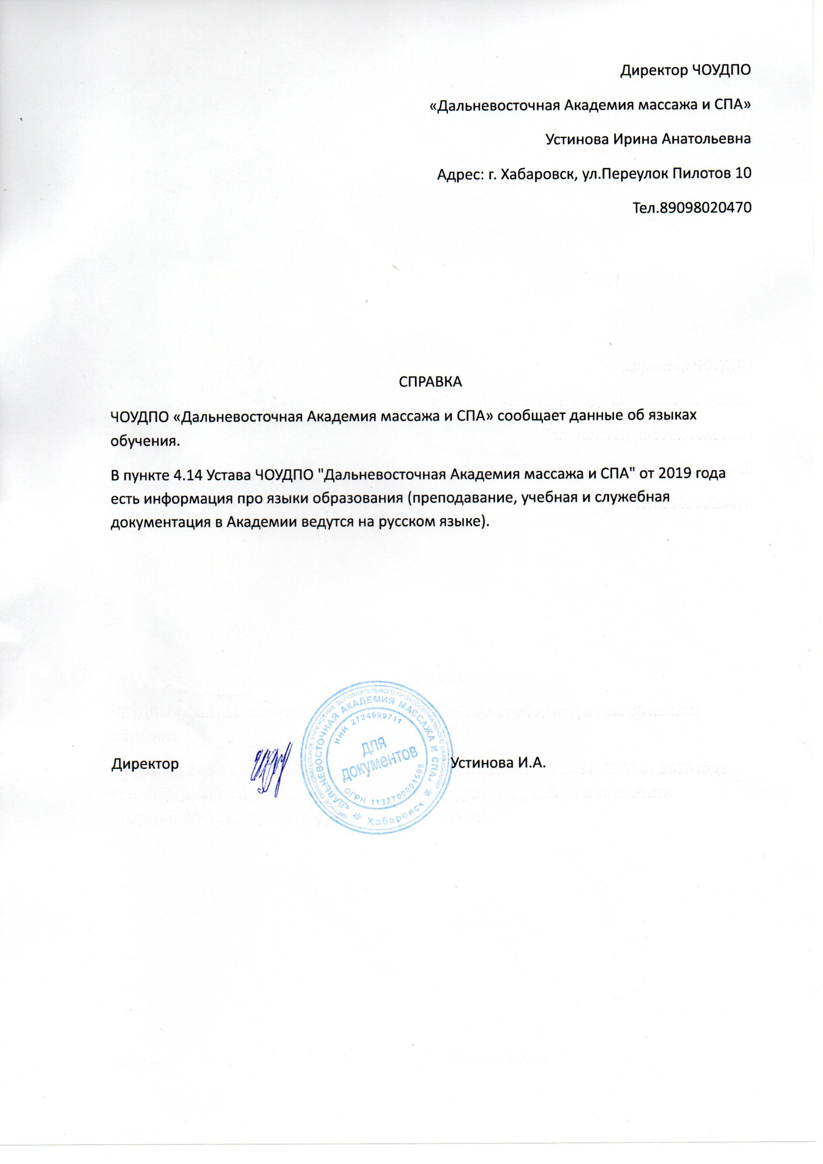 Информация про языки образованияВ пункте 4.14 Устава ЧОУДПО "Дальневосточная Академия массажа и СПА" от 2019 года есть информация про языки образования ( преподавание, учебная и служебная документация в Академии ведутся на русском языке).